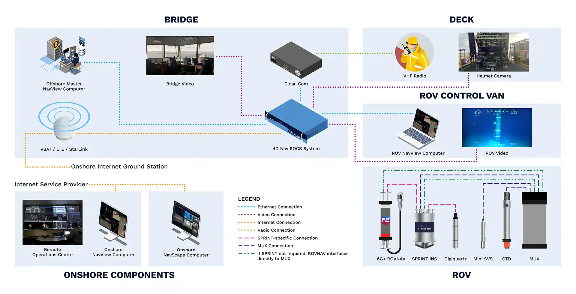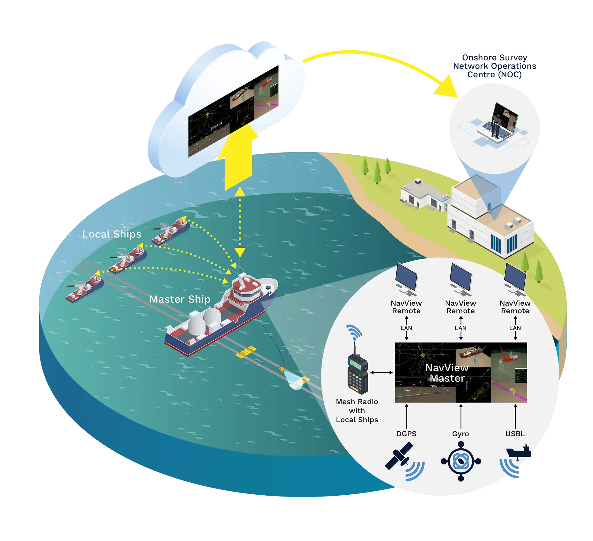 Our technology consists of several components that can be provided individually or as an integrated system. The offshore component includes a network of NavView systems configured with a master that can be operated by a surveyor, whether in person or remotely, along with smart remotes connected to the master on each vessel. A sophisticated protocol ensures they remain in sync. It allows position and background data to be displayed with custom layouts tailored for users such as bridge personnel, ROV personnel, project teams, and clients. If a smart remote has sufficient privileges, data and instructions can be entered on it and shared with the other computers on the network. The master system can be securely networked to a NavView system onshore using our proprietary ROCS (Remote Operations Control System) unit and communication protocol.
