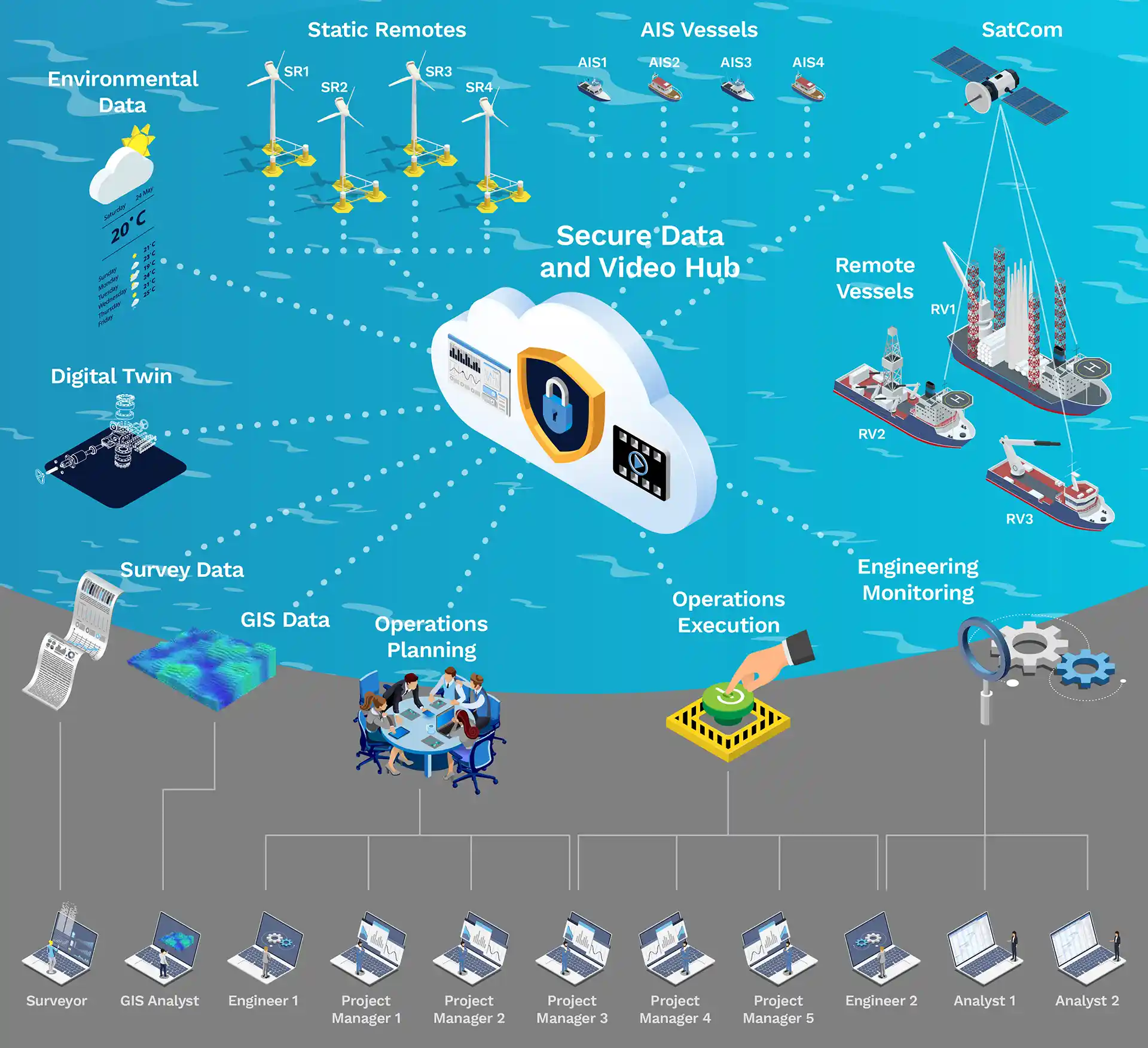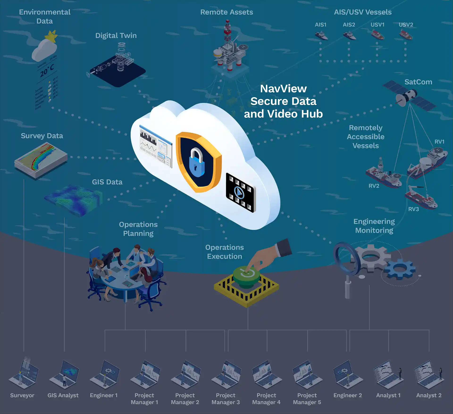 Since 2019, we have been offering commercial remote survey services using our NavView systems offshore, which are connected to NavView stations onshore. Before launching this service, we spent several years developing the technology to synchronize the files and databases used by NavView over satellite links. The technology is made up of components that can be integrated to form a comprehensive ecosystem for monitoring and controlling offshore operations.
