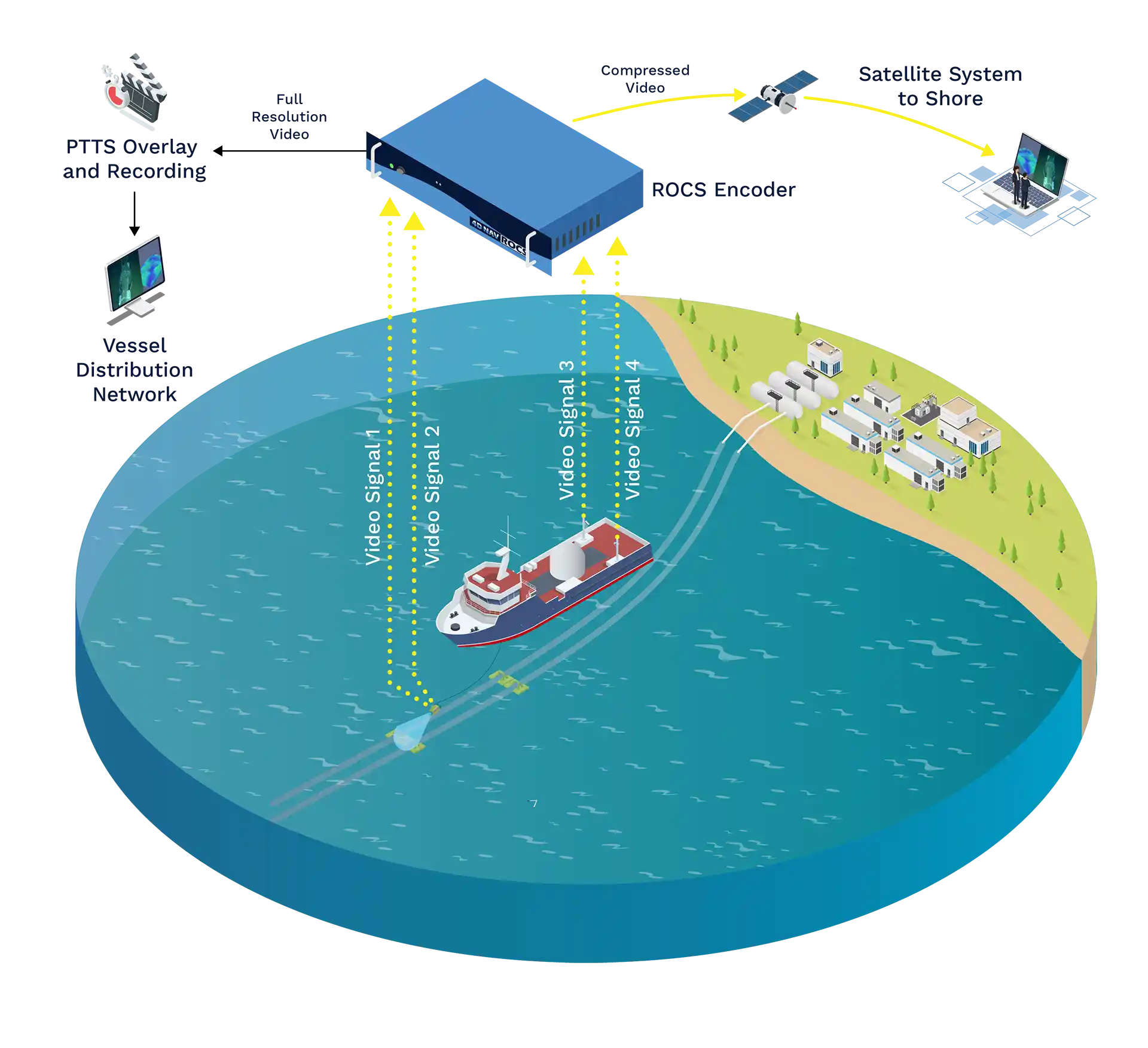 Our simplest configuration is a ROCS unit with offshore video feeds connected to our video server, accessible through our NavScape web app. When multiple vessels are equipped with ROCS units, they can be viewed in the same NavScape app. Adding our PTSS control box enables the recording and retrieval of high-resolution video data onboard the vessel, while our NavScape web application allows segments to be transmitted onshore and viewed in full resolution.